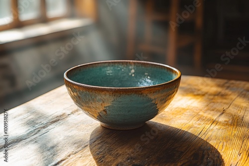 bowl, pottery, ceramic, wood, sunlight, rustic, kitchen, table, hand-made, craft, art, decor, home, interior, design, blue, glaze, shadow, warmth, natural, artisanal, texture, vintage, light, morning, domestic, peaceful, wooden table, home decor, natural light
