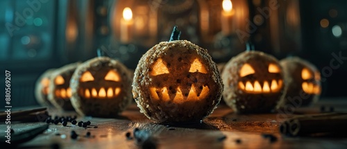 Handcrafted ghoulish meatballs with spooky faces and dark spices, candlelit background, Watercolor, Scary and delicious