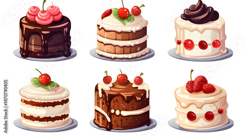 Hand-drawn Collection of Cakes on White Background for Bakery or Dessert Concept