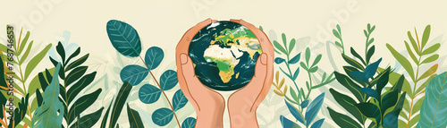 Hand-drawn illustration of a person holding the earth, surrounded by plants, symbolizing care for nature and the environment.