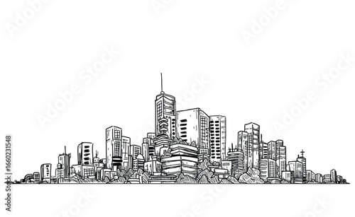 Hand-drawn vector illustration of a cityscape, sharp black lines on a clean white background. Simple yet modern composition of urban buildings in a straight-on view