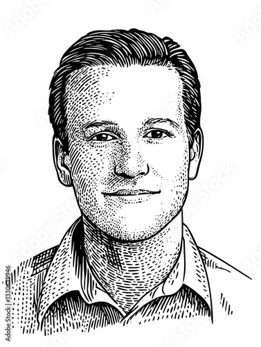 Hand-drawn vintage vector illustration of a smiling man with short hair wearing a collared shirt