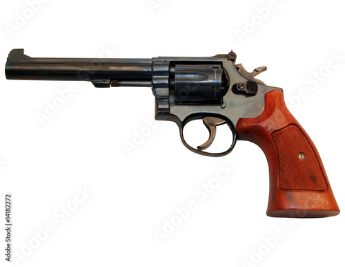 handgun, gun, handgun, long, trigger, white, background, copy, space, horizontal, wood, grain, handle, grip, safety, isolated, weapon, 6, shooter, smith, crime