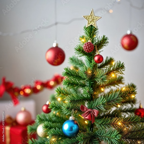 Handmade Christmas tree with ornaments and garland, garland, ornaments