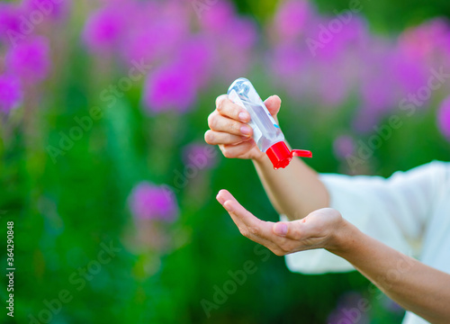 Hands are treated with a sanitizer with alcohol. Rules of conduct during quarantine concept
