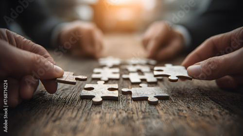 puzzle, teamwork, collaboration, problem solving, solution, assembly, connection, together, business, strategy, success, concept, team, oneness, cooperation, partnership, joining, piece, hand, wooden, table, closeup, working, people, challenge, support, building, group, meeting, office, board, planning, corporate, communication, human relationships, agreements, merger, deal, project, goal, achieve, effort, skill, creative, idea, innovation, sharpened, closeup