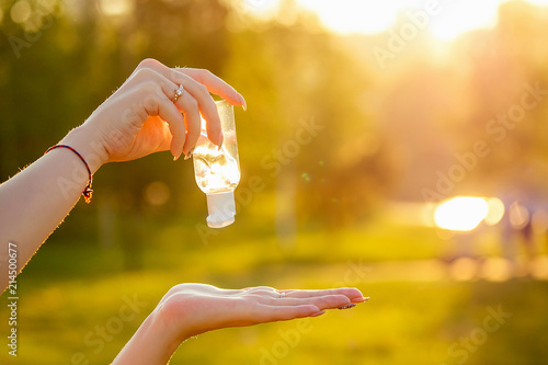 hands closeup of woman applying antiseptic antibacterial gel in summer day in field greens grass background. protection from germs at picnic in a trip travel