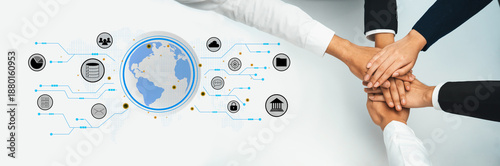 Hands from different individuals pile together around a digital globe, illustrating collaboration and connection in a modern business environment with technology elements. Trope