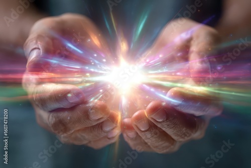 hand, light, energy, burst, colourful, hope, power, magic, glow, bright, vibrant, spiritual, healing, offering, protection, cupped, holding, giving, receiving, cosmic, universe, galaxy, star, aethereal, mystical, divine, creation, potential, future, innovation, technology, connection, human, skin, finger, palm, care, support, guidance, inspiration, imagination, dream, fantasy, wonder, awe, positive, positivity, blessing, gift