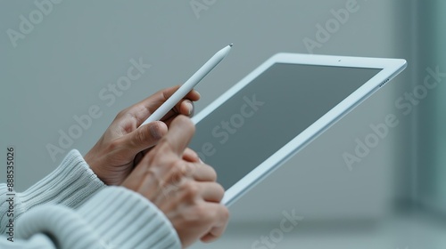 Hands holding a digital pen and a tablet, taking notes during a business seminar, highlighting the role of digital tools in professional development. Height Resolution Photo, , Minimalism,