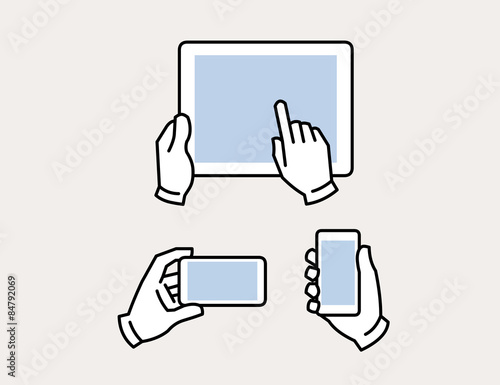 hand, hold, phone, tablet, mobile, touch, finger, swipe, icon, point, display, click, screen, show, device, smartphone, simple, line, vector