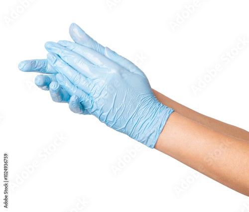 Hands in medical gloves rubbing together on an empty background. Hygiene, antiseptic use, hand sanitization, healthcare themes, design use.