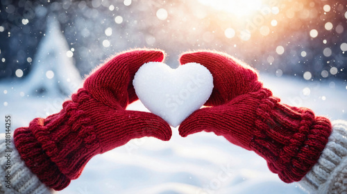 Hands in woolen knitted red gloves holding heart shaped snowball on snowy background. Concept of love for winter season, snow or valentine's day