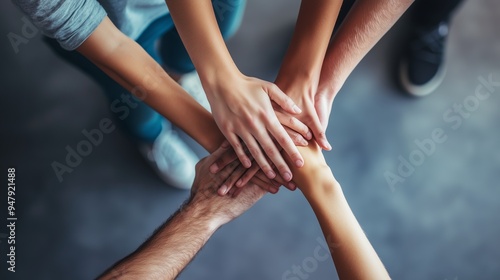 Hands joined together in unity during a team-building exercise in a collaborative workspace