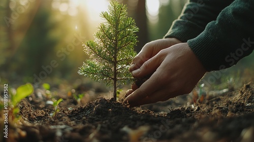 hands nurturing a young conifer in a forest, showcasing sustainable forestry practices, reforestation efforts, and ecosystem preservation, promoting nature conservation and soil protection
