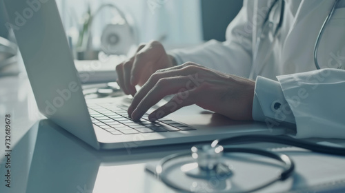 doctor, laptop, health care, technology, medicals, typing, stethoscope, computer, professional, clinic, white, coat, hand, keyboard, information, hospital, work, care, health, online, datum, electronic, record, consultation, research, modern, office, practitioner, digital, physician, desk, practice, equipment, medicine, diagnosis, communication, management, cyberspace, device, silver, paperwork, light, blue