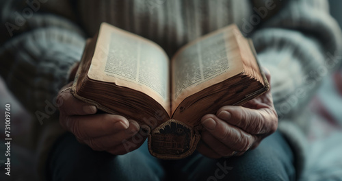 Hands of a person holding a book. Close-up. Intellectual knowledge. A special and old-looking book.