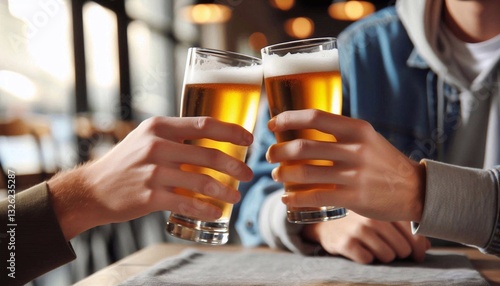Hands of two friends clinking glasses of beer in a cafe, close-up