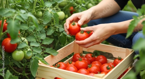 Hands picking ripe red tomatoes from a plant into a wooden crate