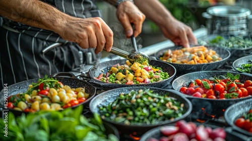 Hands preparing a meal with organic ingredients at a sustainable outdoor kitchen. Minimal and Simple style