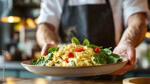 Hands present a plate of scrambled eggs with spinach and tomatoes, brain-boosting meal, nutritious and easy.