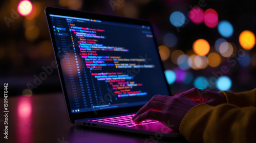 hands programming on laptop with lights