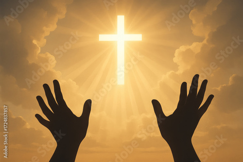 Hands reaching up towards a glowing cross in a cloudy sky with sun rays