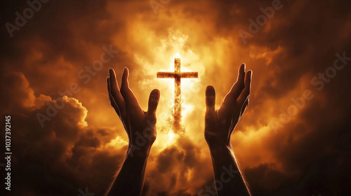 Hands reaching up towards a glowing cross in a dramatic, spiritual religious scene, symbolizing faith, prayer, and devotion, with a golden light in the background
