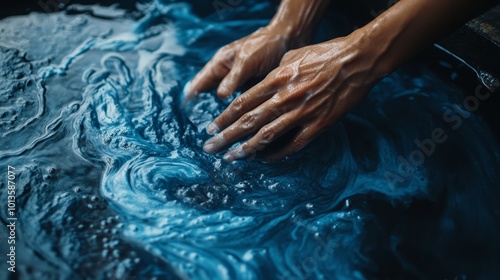 Hands swirling in blue liquid, creating a mesmerizing pattern.