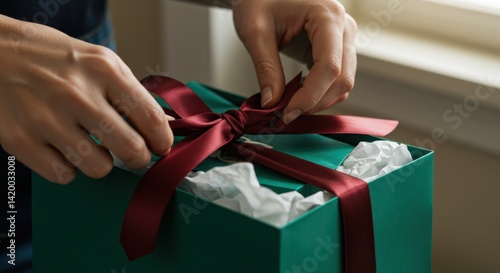 gift, present, surprise, celebration, birthday, christmas, holiday, wrapping, ribbon, bow, hand, tying, opening, package, emerald, green, red, burgundy, box, paper, giving, receiving, festive, elegance, event, wrapping paper, closeup, detail, indoor, preparation, occasion, gift wrapping, craft, object, generosity, love, care, joy, happiness