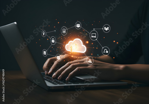 Hands typing on a laptop with a glowing cloud computing icon and interconnected data symbols. Represents cloud technology and network solutions.