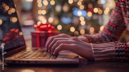 Hands Typing on Keyboard with Cyber Monday Sale Banners in Background