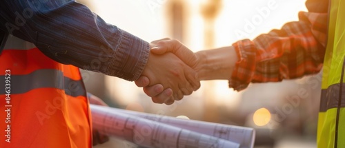 Handshake between architects over blueprints at a lively construction site Both in safety vests, with a blurred construction backdrop, indicating successful project agreement