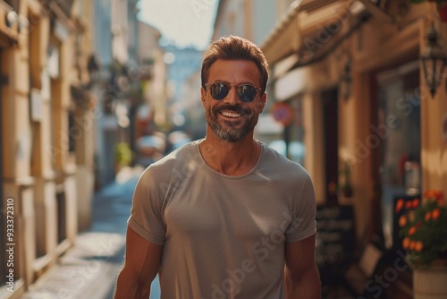 Handsome 30-year-old muscular elegant tourist happy