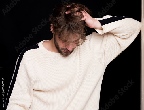 man, photogenic, bearded, beard, sweater, black, white, fashion, fashionable, stylish, unshaved, young, guy, hand, raised, face, studio, boy, knitted, male, macho