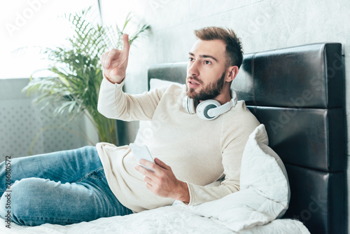 handsome bearded man in headphones holding smartphone and gesturing in bedroom