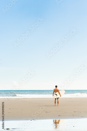 Handsome boy in blue swimming shorts and cap stand with long surf surfing board wait on surf spot at sea ocean beach. White blank surfboard. Concept of power, freedom, new modern life, generation Y.