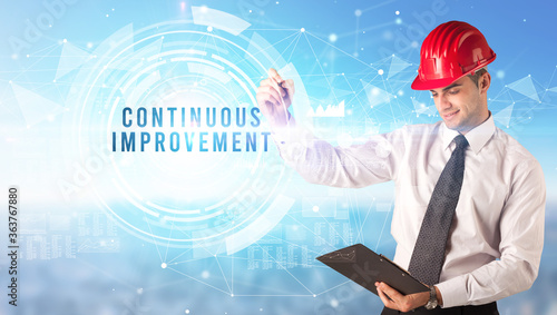 Handsome businessman with helmet drawing CONTINUOUS IMPROVEMENT inscription, contruction business concept