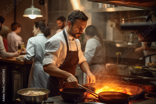 man, caucasian, 30s, cook, chef, eatery, work, cooking, kitchen, food, service, catering, epicure, uniform, people, lifestyle, preparation, team, happy, happiness, staff, attractive, photogenic