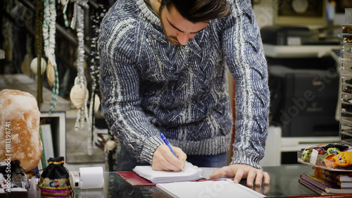 Handsome male shopkeeper keeping accountancy books in his store, writing on paper sheets and reading records