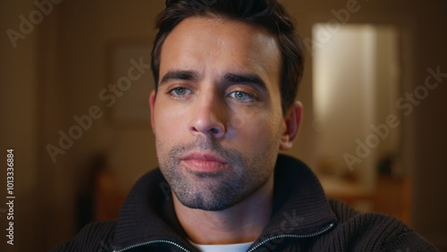 Handsome man gazing distance in dark apartment closeup. Portrait serious guy