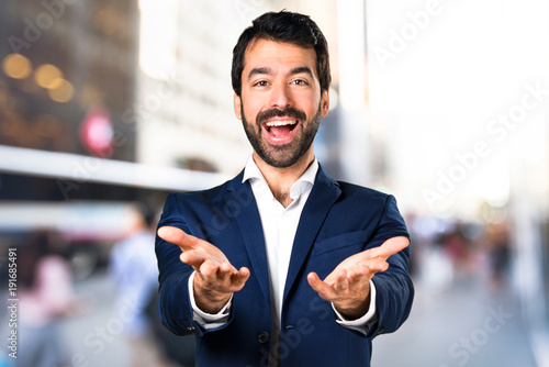 Handsome man presenting something on unfocused background