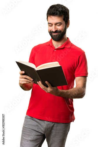 adult, background, beautiful, book, boy, booklet, casual attire, catalog, caucasian, guy, hand, photogenic, holding, isolated, learn, mag, male, man, man, model, note, paper, people, person, portrait, standing, studio, text, white, young