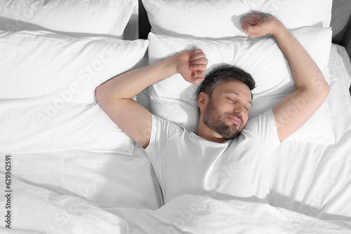 Handsome man sleeping in soft bed, top view