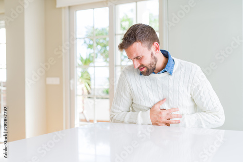 Handsome man wearing casual sweater with hand on stomach because nausea, painful disease feeling unwell. Ache concept.