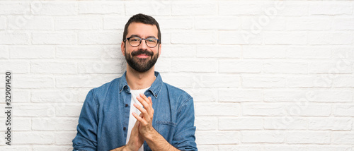 Handsome man with beard over white brick wall applauding after presentation in a conference