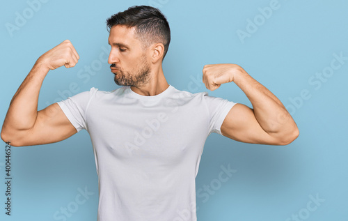 Handsome man with beard wearing casual white t shirt showing arms muscles smiling proud. fitness concept.