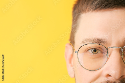 accessory, adult, background, care, caucasian, closeup, colours, corrective, eyeglass, eye, eyewear, far-sightedness, fashion, goggles, photogenic, health, lens, lifestyle, look, male, man, medicals, medicine, myopia, opthalmology, optical, people, person, portrait, sight, style, trend, vision, wear, wearing, yellow