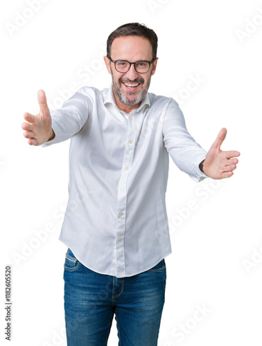 Handsome middle age elegant senior business man wearing glasses over isolated background looking at the camera smiling with open arms for hug. Cheerful expression embracing happiness.