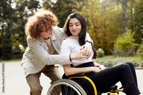 man, male, guy, girl, woman, female, girlfriend, people, disabled, disability, paralyzed, disease, assistance, wheelchair, rehabilitation, outdoors, street, park, equipment, brunette, smiling, adult, lifestyle, young, happy, sitting, couple, hug, huddle, friendship, curly, freckle, goggles, to sit, redhead, braces, beautiful, hand, help, communication, accident, casual attire, cheerful, friends